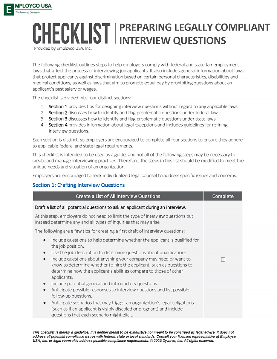 Click the following link to access the Checklist – Preparing Legally Compliant Interview Questions. Additionally, you can contact us for support with your entire hiring process including access to our library of job descriptions, survey data of average salaries by position, offer letters, and restrictive covenants.