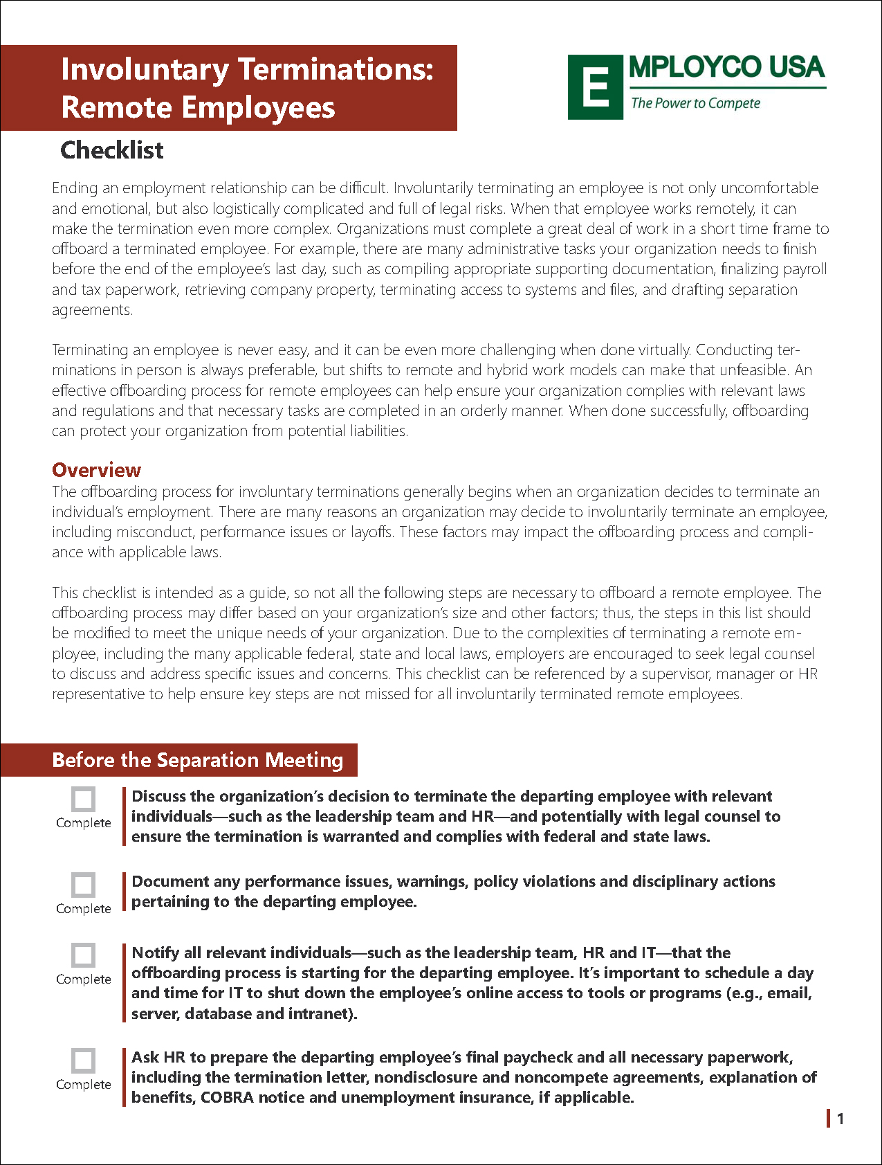 Ending an employment relationship can be difficult. Involuntarily terminating an employee is not only uncomfortable and emotional, but also logistically complicated and full of legal risks. When that employee works remotely, it can make the termination even more complex. Organizations must complete a great deal of work in a short time frame to offboard a terminated employee. For example, there are many administrative tasks your organization needs to finish before the end of the employee’s last day, such as compiling appropriate supporting documentation, finalizing payroll and tax paperwork, retrieving company property, terminating access to systems and files, and drafting separation agreements.